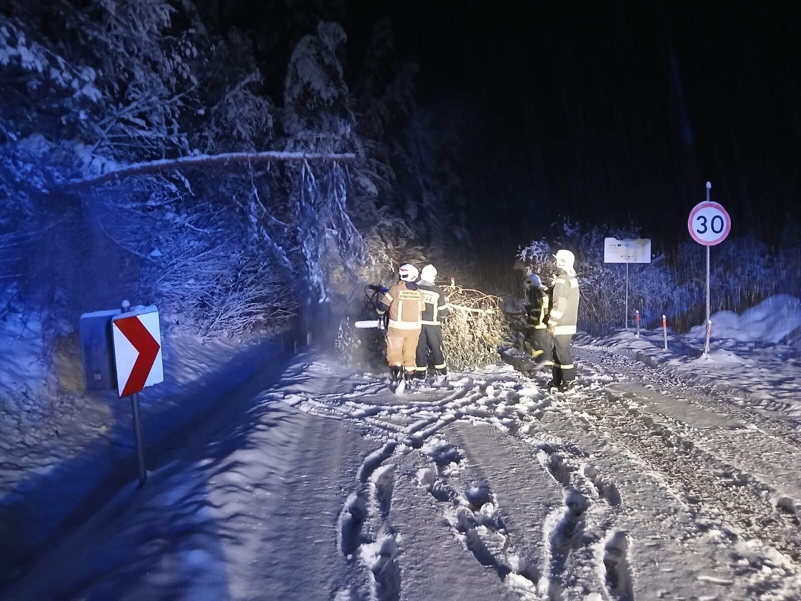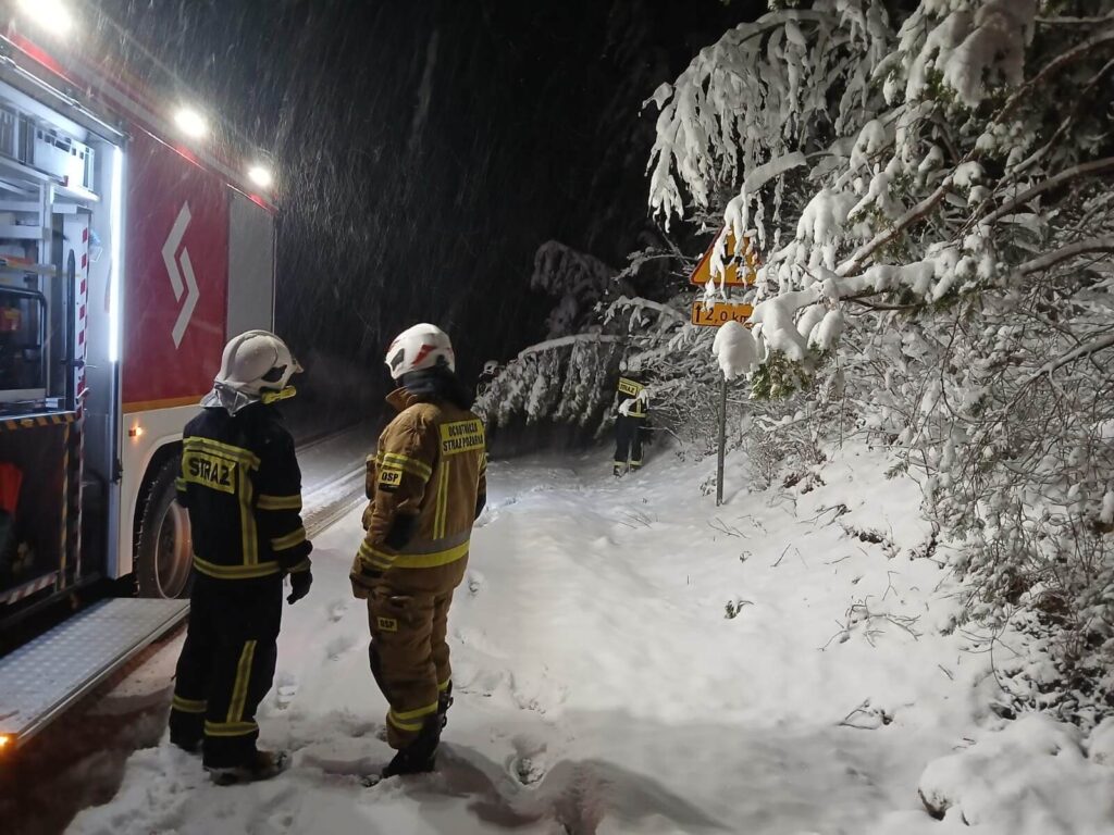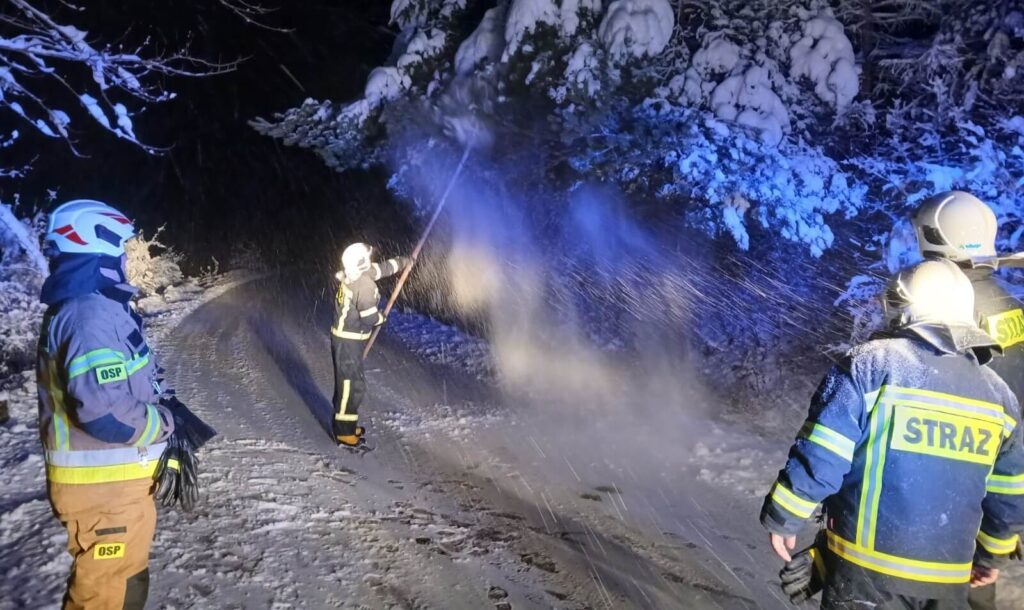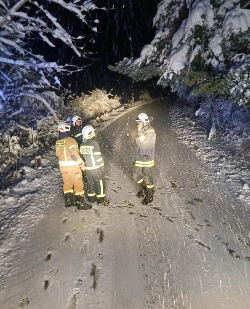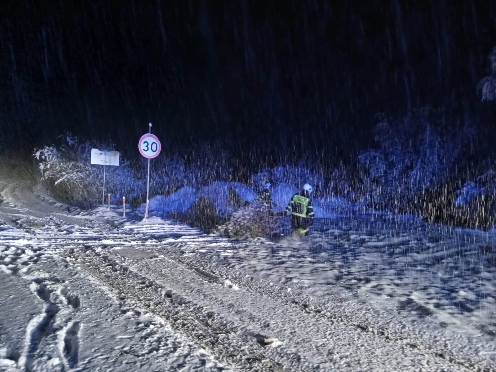 W zeszłym tygodniu dotarła do nas zima z intensywnymi opadami śniegu. Mokry i ciężki śnieg łamał przydrożne drzewa blokując przejazd na drodze powiatowej. Byliśmy dwukrotnie wzywani do usunięcia połamanych drzew z drogi. Na szczęście żaden z pojazdów poruszających się drogą nie został uszkodzony i nie było osób poszkodowanych.